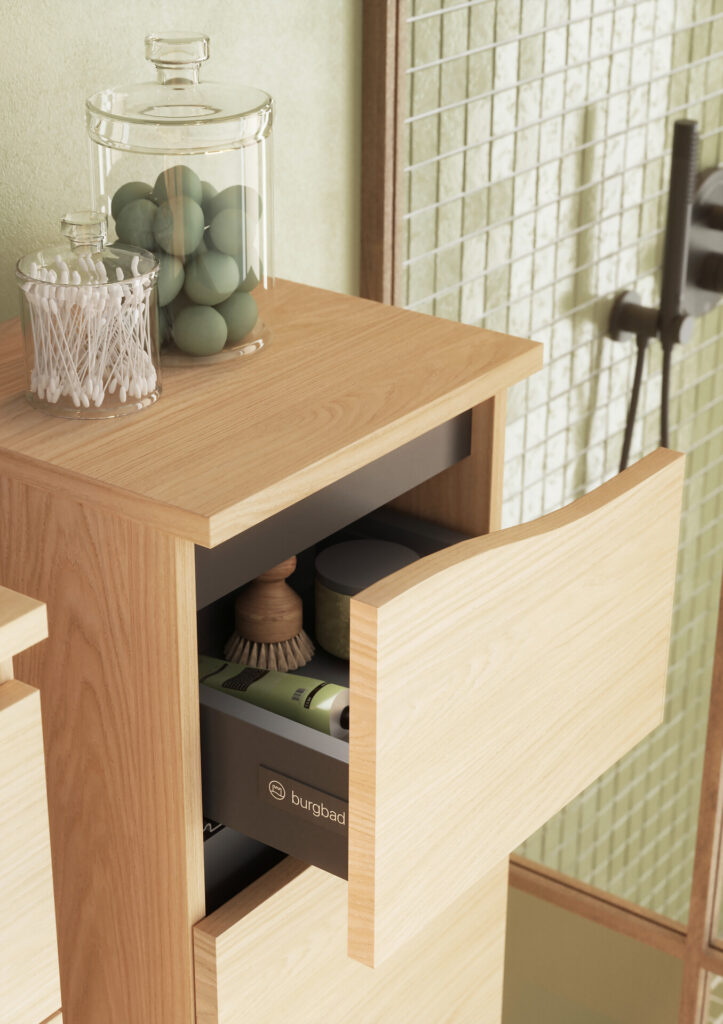 Als Komplettprogramm bietet Sinea 3.0 auch eine eigene Gästebadlösung. Die schmale Waschtischkombination mit seitlicher Hahnlochbank und per Tip-on-Technik zu öffnender Tür realisiert das asymmetrisch tiefenreduzierte Layout auf 520 mm Breite und einer maximalen Tiefe von 300 mm.